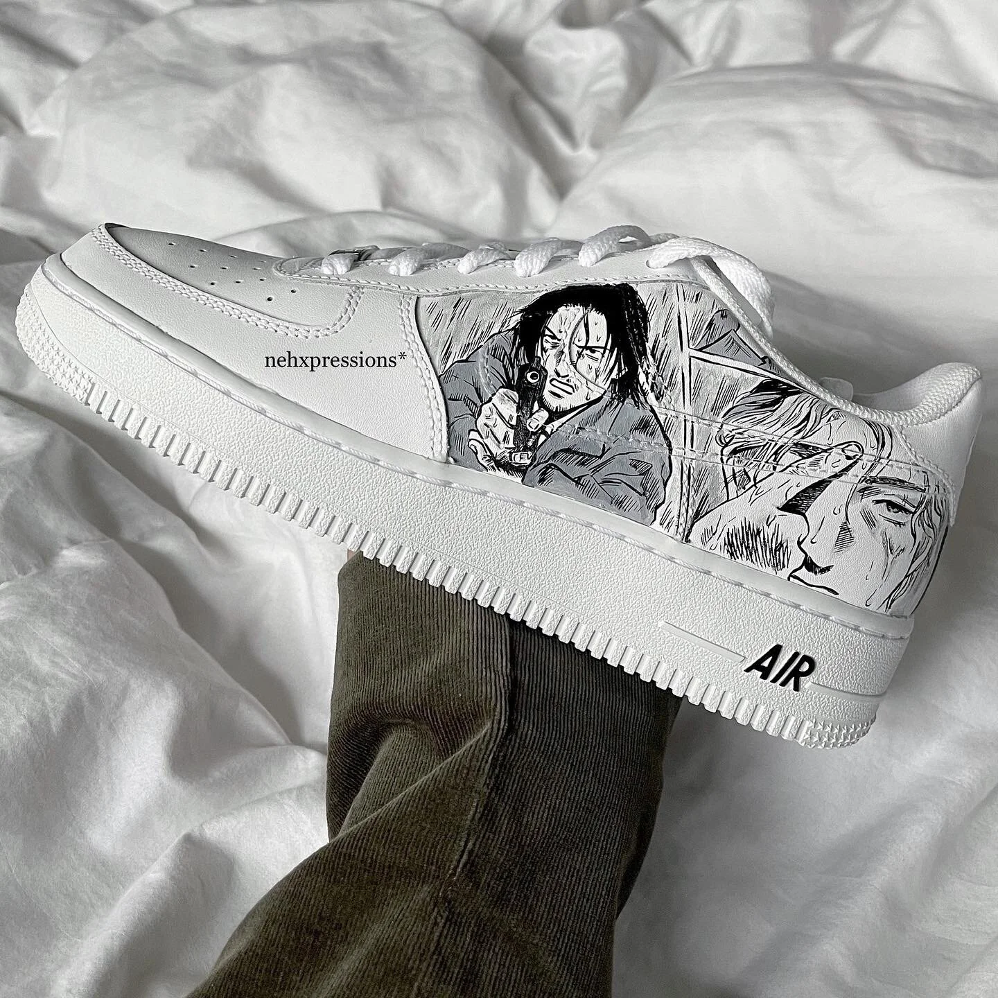 fully handpainted with angelus leather paints and sealed with satin finisher (crack, water, and chip proof)